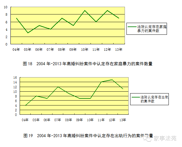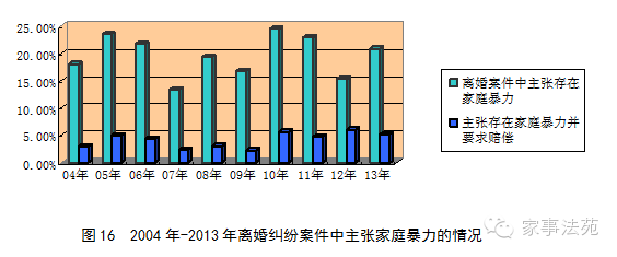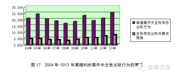 从统计数据可以看出,2004至2013年案件中均存在主张家庭暴力的案件,案件比例分别为2004年18%、2005年23.49%、2006年21.62%、2007年13.33%、08年19.33%、2009年16.67%、2010年24.44%、2011年22.82%、2012年15.33%、2013年20.77%。而近十年来主张对方出轨的离婚案件数量,除个别年份波动外,一致占全部离婚案件总数的16%-26%这个区间,并没有太大幅度的波动。2004年20.67%,2005年24.16%,2006年20.27%、2007年占18.67%,2008年占16.67%、2009年占18%,2010年占22.96%、2011年占18.79%,2012年占20.67%,2013年则占25.38%(如图16、17示)。