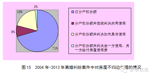 但是房屋不“归边”处理,则必定判决房屋产权由双方当事人各占部分份额。从统计数据中看,大部分案件仅判决双方当事人对房屋产权各占部分份额,或者仅笼统判决该房屋由双方当事人共同使用。但由双方当事人各占部分产权的处理方式,也会引起很多后续问题。其一,作为离婚案件的双方当事人,必定是因感情不合无法共同生活才会起诉离婚,则即使判决双方各占部分产权,双方当事人也无法具体实现房屋产权中的使用权,即无法共同使用该房屋。即使双方为了生存需要仍然共同居住在该房屋中,也可能激发双方的矛盾,甚至产生暴力行为。其二,作为感情不合的双方当事人,对如何处置该房屋大都无法理性沟通,故即使拟将该房屋出卖变现,该房屋如何具体出卖,双方当事人亦可能无法达成一致意见,导致房屋难以变现。其三,部分当事人会霸占唯一房屋,导致另一方当事人无法使用该房屋。