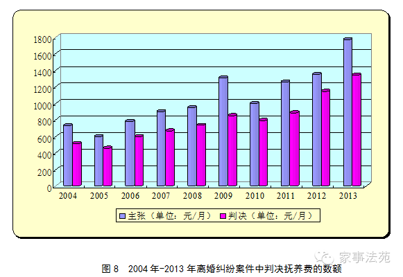 由下图中可以看出,抚养费的主张数额总体呈上升趋势,但上升速度缓慢;法院判决抚养费的数额亦呈上升趋势,但上升幅度较之主张的数额更缓,且总是低于主张的数额。当事人主张的抚养费数额在2009年便已超过1000元,而判决数额却在2012年才大于1000元(如图8示)。