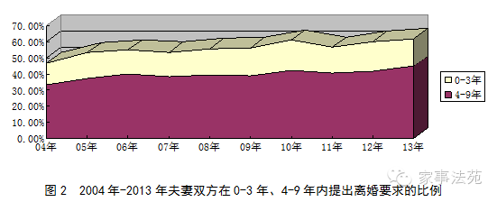 统计数据显示,夫妻双方在登记结婚后4-9年内提出离婚要求的比例十年来均为最高,分别为:2004年为33.33%,2005年为36.91%,2006年为39.86%,2007年为38%,2008年为39.33%,2009年为38.67%,2010年为42.22%,2011年为40.27%,2012年为41.33%,2013年为44.62%(如图2示)。