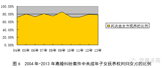 从案件判决结果来看,假如父母双方对未成年子女的抚养权存在争议,经法院审理后,未成年子女抚养权判归女方的比例均超过70%(如图6示)。