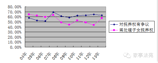 图5 2004年-2013年离婚纠纷案件中双方当事人对抚养权有争议的案件比例