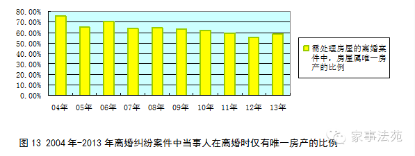 从统计数据中可以看出,需要处理房产的离婚案件中,存在两套以上的房产的案件虽然呈上升趋势,但仍不会超过50%,而仅存在唯一房产的案件则均超过50%。也即是说,大部分的当事人在离婚时仅有唯一一套房产(如图13示)。