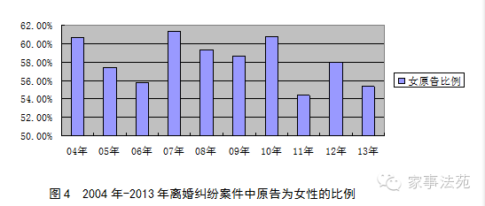 从案件受理情况来看,十年来女性作为原告提起离婚诉讼的比例大于男性为原告的比例,可见,休夫的女性多于休妻之男(如图4示)。