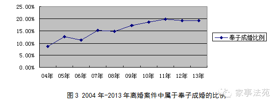 同时,离婚案件中属于奉子成婚的比例也呈急剧上升的态势,2013年属于奉子成婚的案件比例为19.21%,而在2004年,该比例仅为8.45%(如图3示)。