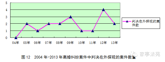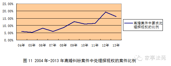 从统计数据看来,在离婚案件中存在未成年子女的前提下,当事人要求法院处理探视权的案件总体呈上升趋势,从2004年对抚养权存在争议案件中主张法院处理探视权案件的6%比例,一直上升到2013年的16.15%,在2012年猛然飙升到19.33%。可见,近年来,特别是2009年以来,当事人对法院处理探视权的需求上升。但是总体比例仍然偏低,最高不超过20%(如图11示)。