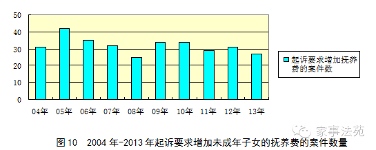统计数据显示,每年到法院起诉要求增加未成年子女的抚养费的案件数量较少,十年来维持在25件至42件的区间(如图10示)。