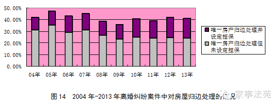 在离婚案件中,对于夫妻双方只有唯一一套房产的处理,有两种处理方式,一是对房屋进行归边处理,也就是把房屋的所有权归属于夫或妻一方所有,由取得房屋所有权的一方支付房屋补偿款给予另一方。为确保房屋补偿款的执行问题,法官通常要求取得房屋产权的一方对房屋补偿款的支付设定担保,但是在实际操作中存在一定困难,可执行的案件数量比例并不高(如图14示)。