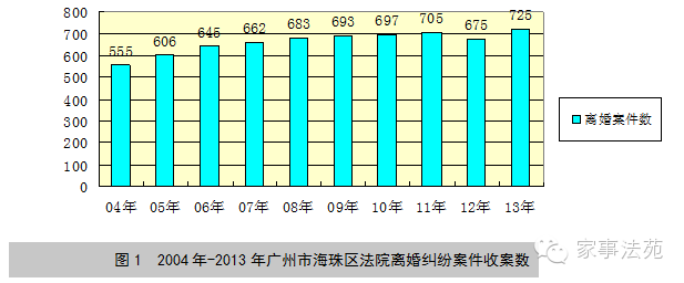 经对广州市海珠区法院审理的离婚纠纷案件统计发现,近十年来离婚纠纷案件的数量持续高发,在民事审判案件数量中占了很大比例。十年来数量分别为(如图1示):