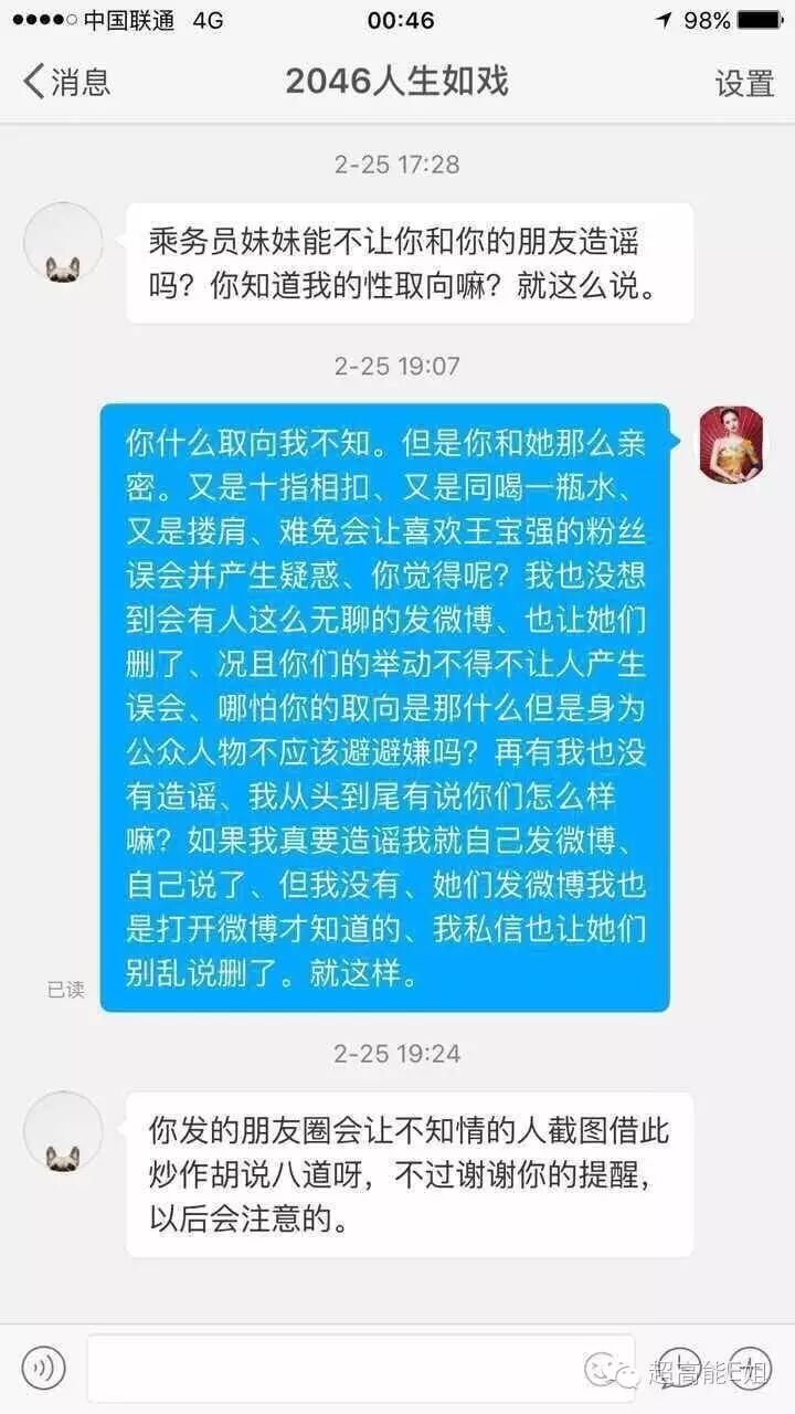 经纪人还给相关网友私信,说自己的性取向(不是女人),但乘务员表示“看到你与她十指紧扣,又同喝一瓶水。”