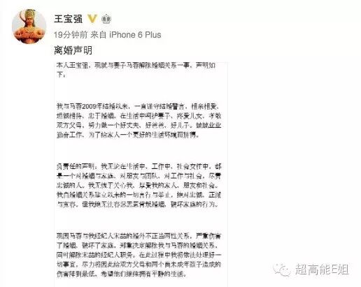 声明中宝宝表示已与结婚七年的妻子马蓉离婚,原因也写得清楚分明——妻子马蓉与经纪人宋喆一直保持着不正当关系!