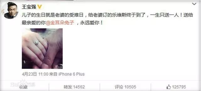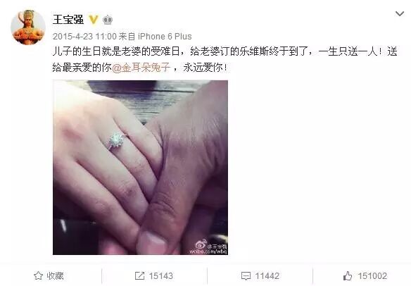 2015年4月23日,在儿子生日之际,王宝强赠送钻石马蓉,并在微博高调示爱:一生只送一人,而马蓉则感动回应:愿得一人心,白首不分离。